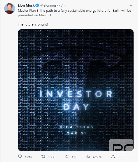 特斯拉 CEO 埃隆・马斯克表示,将于 3 月 1 日在特斯拉投资者日活动上推出特斯拉宏图第三篇章(Master Plan Part 3),即通往地球完全可持续能源未来的道路。