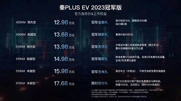 4月7日消息,比亚迪秦PLUS EV 2023冠军版正式上市,新车升级了e平台3.0核心技术,售价12.98-17.68万元。