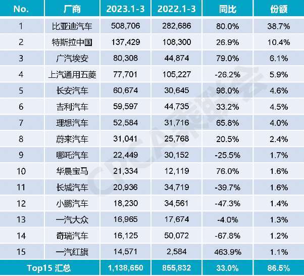 从品牌看,则呈现赢家通吃的局面,零售销量排名前十五的车企共占据市场总份额的86.5%。