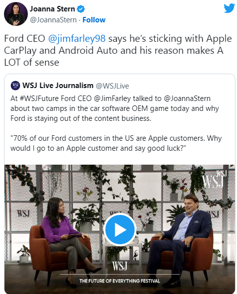 今日,福特CEO吉姆·法利(Jim Farley)接受《华尔街日报》的采访,他对记者乔安娜·斯特恩表示,福特没有计划放弃对苹果CarPlay支持。“我们在美国的福特客户中有70%是苹果客户,我为什么要让这些苹果客户不高兴?“他说。