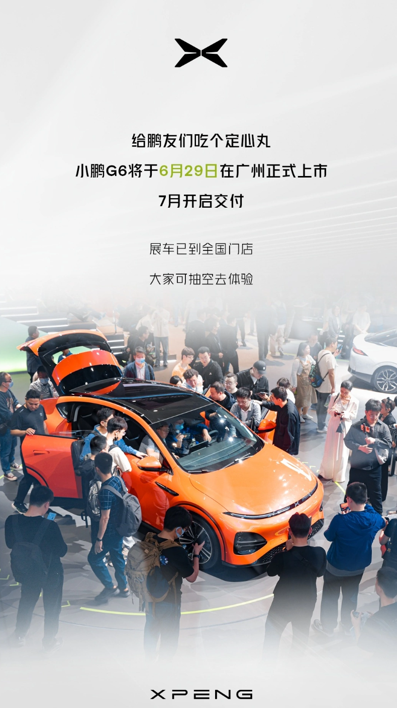 6 月 9 日下午,小鹏汽车官宣旗下新款“超智驾轿跑 SUV”小鹏 G6 将于 6 月 29 日在广州正式上市,7 月开启交付,同时展车已到全国各大门店。小鹏 G6 已开启预售,预售价格为 22.5 万元起。