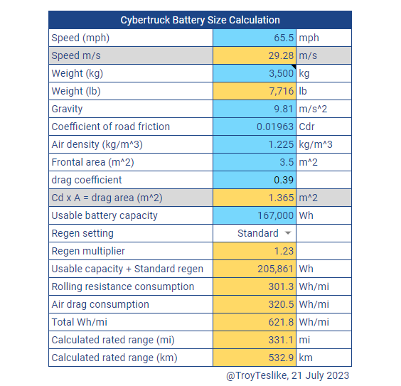 Troy Teslike计算出,Cybertruck的耗电量为571 Wh/mile或355 Wh/km。因此,在105 km/h的恒定速度下,平均值为35.5 kWh/100 km。