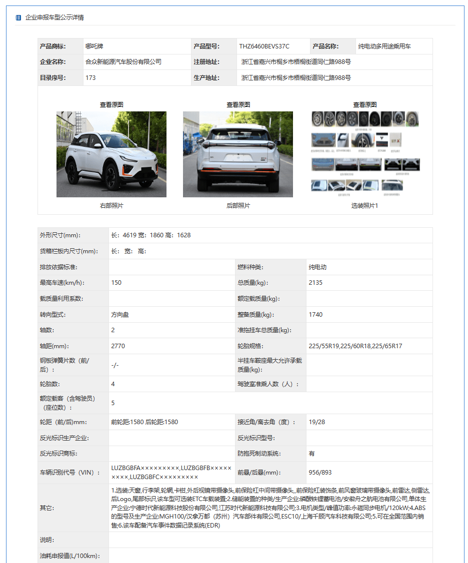 此外,该车搭载菲仕绿能的 TZ180XS113 电机,功率为 120kW。该车还可选装外后视镜带摄像头、雷达等,预计会有辅助驾驶功能,还可选装“哪吒 X”尾标。