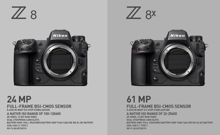 根据流出的数据,Nikon Z8和 Z8x 的机身均内置 5 轴 5.5-Stop 稳定系统,前者支持 ISO 100 至 120,600,而后者则支持 ISO 32 至 25,600。 两款新机均支持6K和12-bit RAW影片摄录,机身内置双CFExpress卡槽,支持可以使用EN-EL 18C电池的全功能电池手把。 此外,Z8和 Z8x 均对应 USB 3.1 Type-C、Wi-Fi 和蓝牙连接。