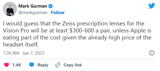 彭博社的马克・古尔曼(Mark Gurman)在最新推文中表示,Vision Pro眼镜夹的成本为“每对至少300-600美元”。