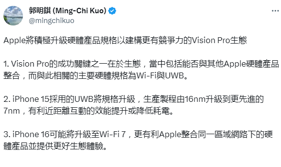 郭明錤称苹果将“积极升级iPhone的硬件规格”,作为其围绕Vision Pro建立竞争生态系统的努力的一部分。 “生态系统是Vision Pro成功的关键因素之一,包括与其他Apple硬件产品的集成,相关的主要硬件规格是Wi-Fi和UWB。“