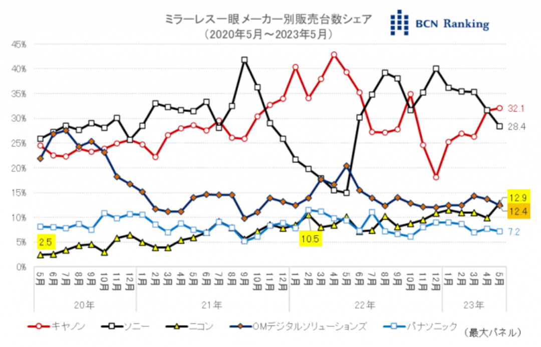 红色为 Canon、黑色是索尼、橘色为 OMD、黄色是 Nikon,蓝色代表 Panasonic(图/翻摄 BCN+R 网站)