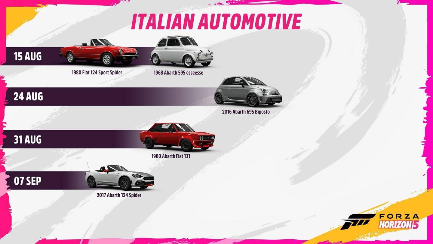 本次更新主要引入了来自意大利车企的 23 款新车,玩家可以在 Festival Playlist、Autoshow 和新 DLC 中驾驶和感受这些新车,包括阿尔法罗密欧、菲亚特、蓝旗亚、阿巴斯等知名意大利汽车品牌的多款车型。