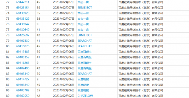 中国商标网上的信息显示,百度从2月7日起就开始陆续申请 “文心一言”相关商标。