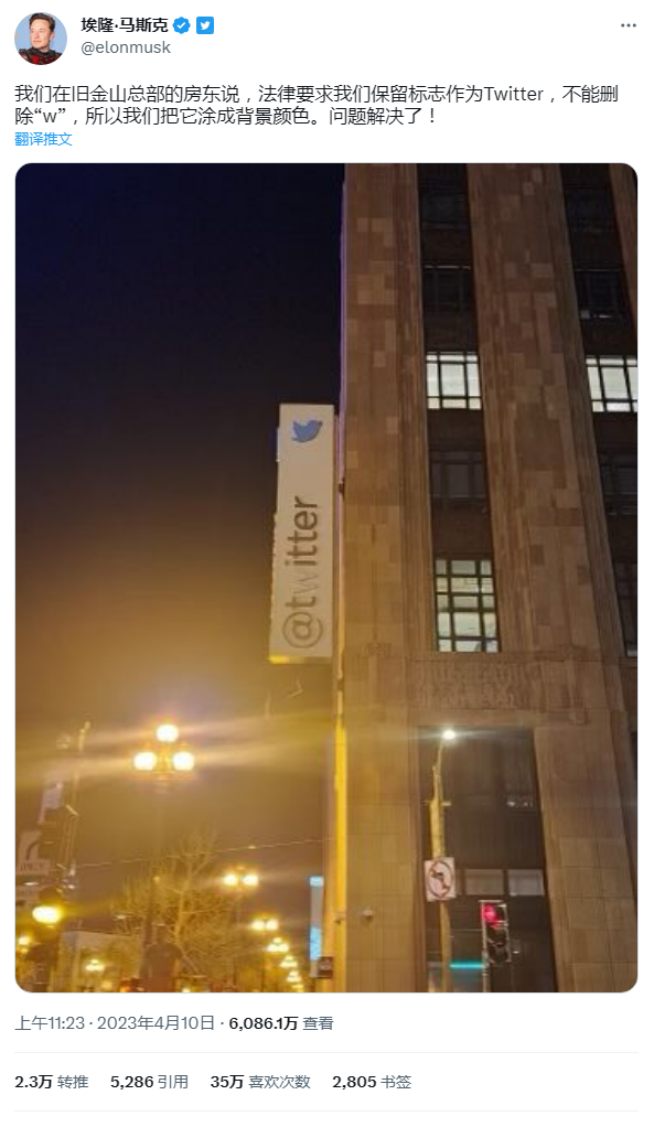 马斯克在照片配文中写道:我们旧金山总部的房东说,法律要求保留推特的标识,不能删除“w”,所以我们把它涂成了背景色。 这样问题就解决了!