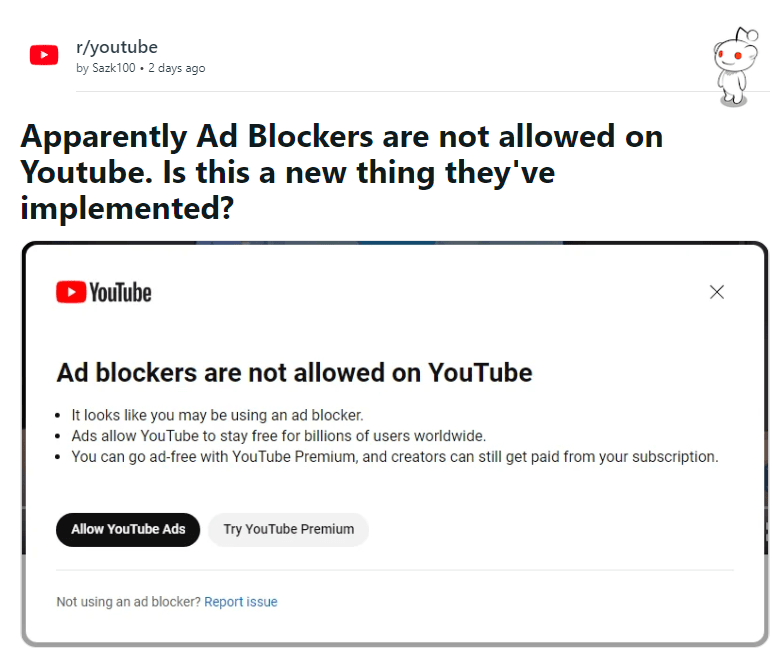 本周,一位Reddit用户发现YouTube弹出了一个窗口,被警告“不允许使用广告拦截器”。