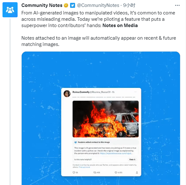 社区笔记在推特发文:“从人工智能生成的图像到被操纵的视频,经常会误导媒体。”“今天,我们正在试行一项功能,将这项权利交到用户手中:媒体笔记。”