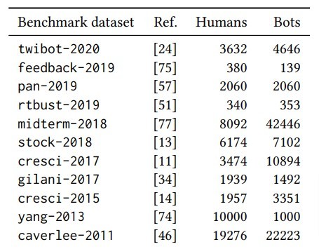 这些论文中的大多数基准数据集都是在不同背景下收集的数据集合。 其中许多是在特定推文(例如包含特定主题标签的推文)中收集的,并且收集的每条推文都被人手动标记为机器人或人类。 然后,使用手动标记的数据集来训练模型,以识别特定上下文中的机器人和人类。