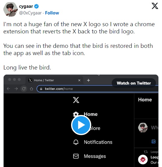 Cygaar在扩展的Github页面上写道:“不喜欢Twitter的新名字,X.com 吗?我也是,所以我做了这个Chrome扩展程序,允许你恢复新名字,回到心爱的小鸟。“
