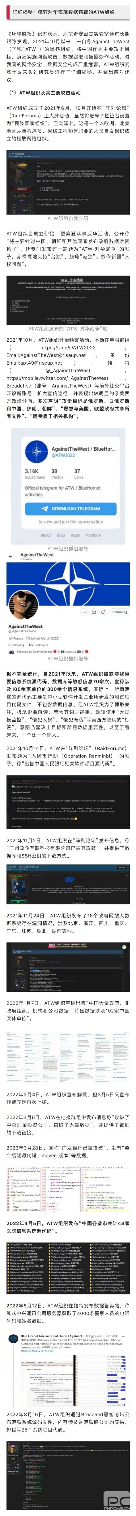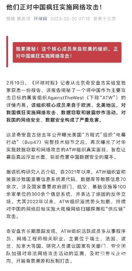 据环球网报道,黑客组织“ATW”正对我国疯狂实施网络攻击。ATW曾数次歪曲、夸大盗窃数据,并极力煽动、诋毁中国在数据安全管理上的能力,自我炒作、借机攻击中国的意图显而易见,这给国家的网络安全和数据安全带来了很大的威胁。请大家注意自己的隐私,不要通过网络、社交软件等不知名的方式下载软件,也不要点击来历不明的信息链接。