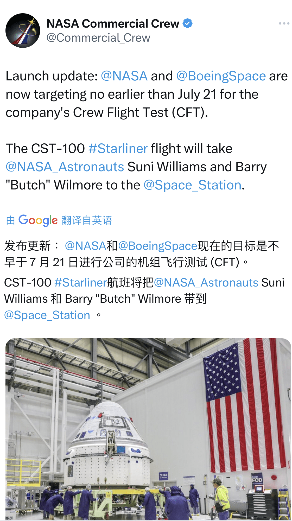 “我们已经考虑并决定,CFT的最佳发射尝试不早于7月21日,”机组飞行测试,美国宇航局商业船员计划经理史蒂夫斯蒂奇告诉记者。
