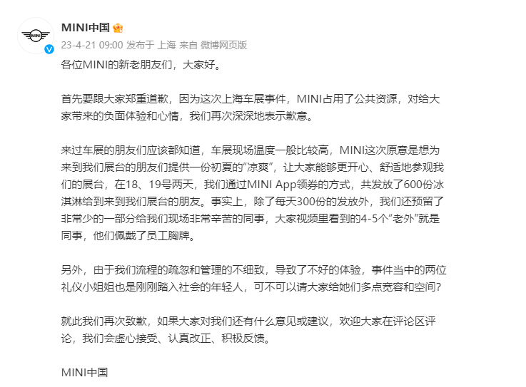 20日下午,MINI中国官方微博回应称:“MINI发起的‘上海车展现场礼-甜宠’活动本意是给逛展的大小朋友送上一份甜蜜。因我们内部管理不细致和工作人员失职引起了大家的不愉快。对此我们真心道歉!我们检讨自己并改善管理、加强内部培训,努力为每位朋友提供好的服务和体验。再次真诚向各位道歉!”