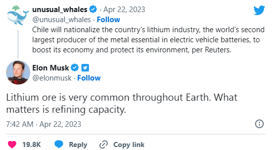 上周五,智利总统加布里埃尔·博里奇(Gabriel Boric)宣布计划将该国的锂产业国有化,并建立国企来生产金属。对此,特斯拉CEO埃隆·马斯克(Elon Musk)回应道,“锂矿在地球上很常见。重要的是精炼能力。”这实际上是在告诉智利人,他们的锂矿并不那么重要。