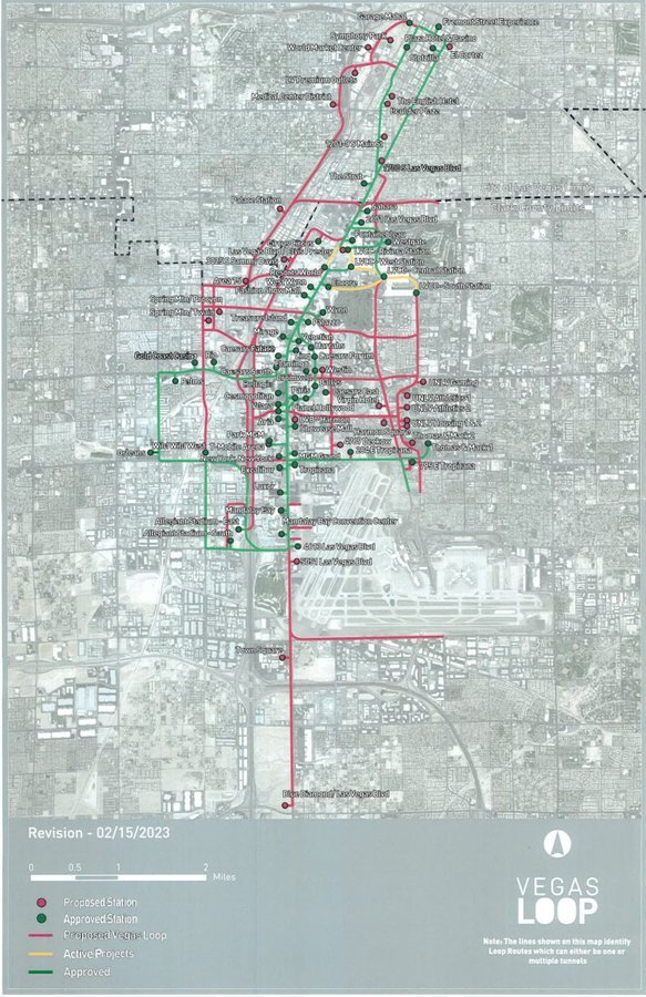 拉斯维加斯环路最初设想为一个拥有29英里隧道和51个车站的地下交通系统。现在,目前的计划是批准扩建后,建造65英里的隧道和69个车站。