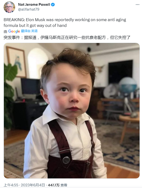 近日,一个名为Not Jerome Powell的推特账户分享了一个帖子,引起了数百万人的关注。 该帖子贴出了一个由人工智能生成的小马斯克的可爱照片。照片中,小马斯克穿着白衬衫配着棕色的背带裤,梳着大偏分,一双大眼睛炯炯有神,给人一种天真可爱的感觉。