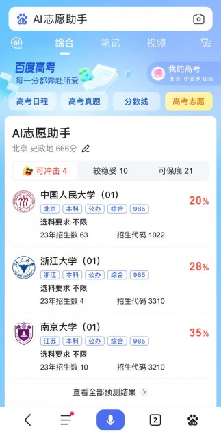 今年百度也全新升级了「AI志愿助手」,高考志愿填报算法依据高校每年最新的招生计划,根据近三年的高校录取分数,参考学校开设专业变动,扩减招数量变动,高校及专业热度等多种算法因子,形成独家算法推荐,计算出考生分数对应的志愿录取概率,分为冲、稳、保、难、易等志愿层次,考生可自主选择适合自己的志愿。辅助用户决策目标志愿,提供一站式志愿填报体验,大幅提高了AI志愿填报的体验性和准确度。此外还有院校对比等实用功能辅助志愿填报。