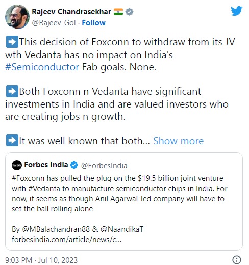 信息技术部部长 Rajeev Chandrasekhar表示,富士康的决定不会对印度的计划产生影响,他补充说,两家公司都是“正在该国创造就业机会和增长的重要投资者”。