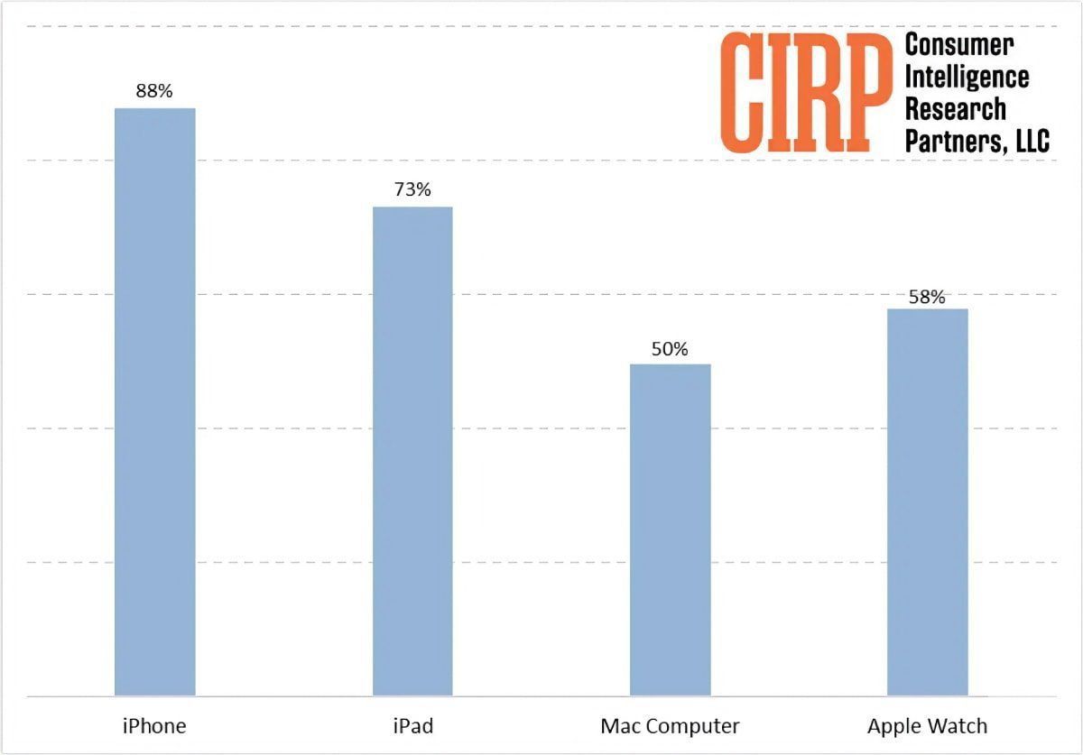 根据消费者情报研究合作伙伴(CIRP)公布的最新报告,88% 的受访苹果用户都有 iPhone;73% 的受访者都有 iPad。Apple Watch 的拥有率以 58% 位居第三,Mac 以 50% 位居第四。