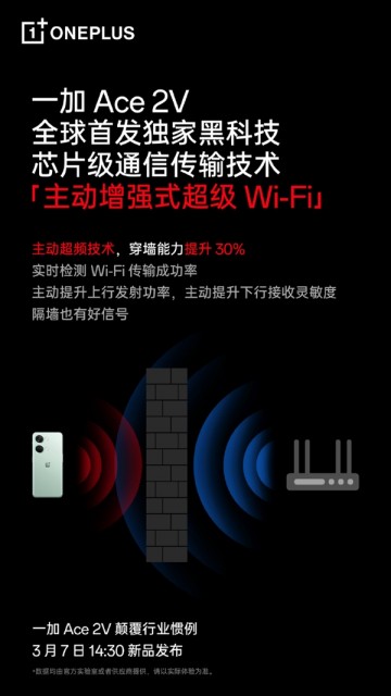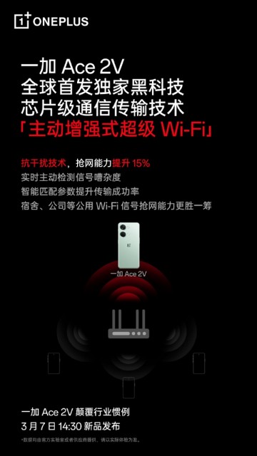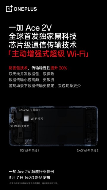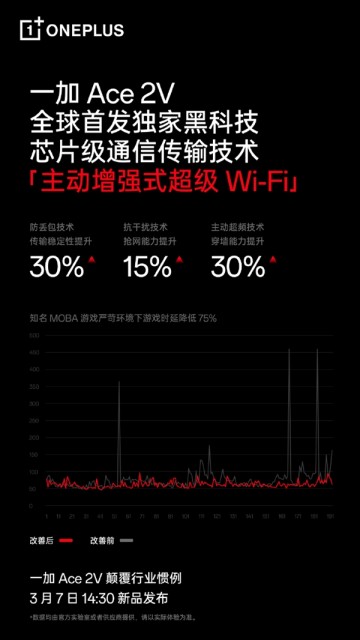 一加Ace 2V即将在3月7日发布,今天一加官方又公布了这款手机的另一个黑科技——全球首发自研黑科技“主动增强式超级Wi-Fi”技术,将与游戏云计算专网一起,彻底解决弱网环境下的卡顿问题。