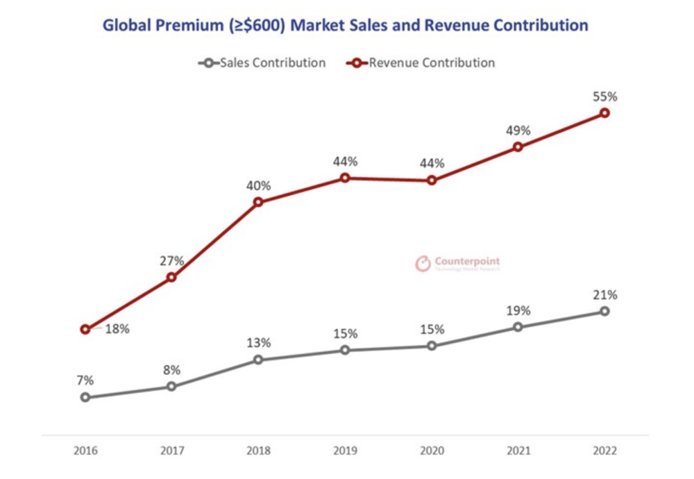 根据 Counterpoint 的数据,高端智能手机销量(价格超过 600 美元)占2022年所有智能手机销量的 55%。
