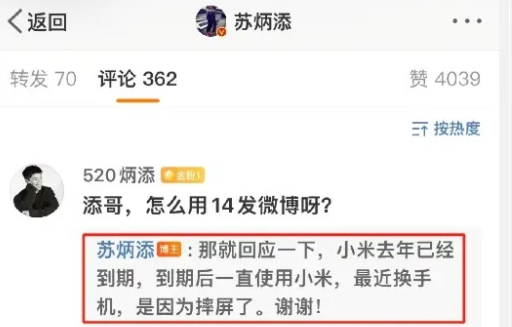 近日,中国著名短跑运动员苏炳添使用iPhone14发微博,引起了网友们的热烈讨论。有网友质疑,为什么不再使用小米手机了。对此,苏炳添在微博回应称,他和小米的代言合同早在去年就结束了,到期后还在用小米手机。最近换手机,是因为摔屏了。