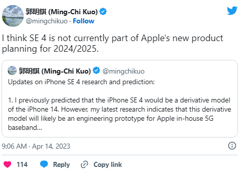 事实上,郭明錤对iPhone SE 4的预测也是不停在改变,最早说苹果取消推出,但过不久又说重启开发,不只搭载苹果自研5G芯片,还会升级OLED屏幕以及增大为6.1寸,整体可视为iPhone 14的更入门版; 郭明錤最新博文再度改口,iPhone 14 的小改版可能仅是工程样机,目前并没有大量生产与销售的计划。