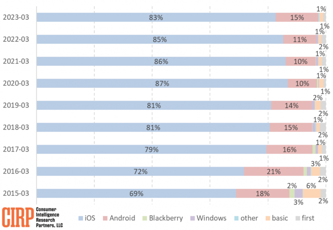数据显示,今年度有15%的新iPhone用户表示,他们前一款手机为Android,其比例是自从2018年以来的新高,过去三年之间仅落在10%上下,比起去年一口气提高了4%,或说明iPhone 14阵容对于Android用户相当有吸引力。