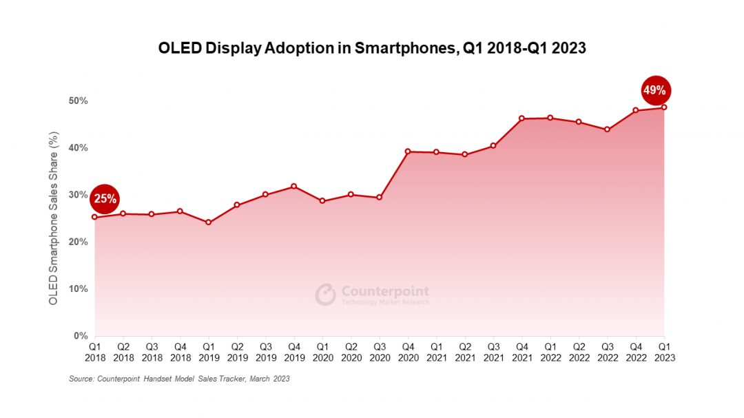 据研调机构Counterpoint Research发布最新调查报告指出,采用OLED屏幕面板的智慧型手机于全球手机销售量占比,在2023年第一季创下高达49%的份额,创下历史新高纪录。 尤以手机批发平均价格落在250 美元以上的机款为大宗、市占率高达九成四。