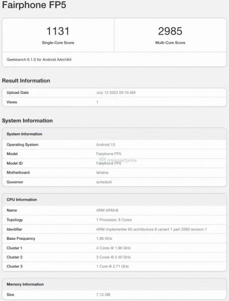 最新消息传出,近日在知名跑分平台 Geekbench上,出现一款 Fairphone 新机,型号显示为FP5,搭载代号显示lahaina的八核心处理器,跑分测试成绩单核心为1131、多核心为2985,内建8GB 内存,预载作业系统为Android 13。