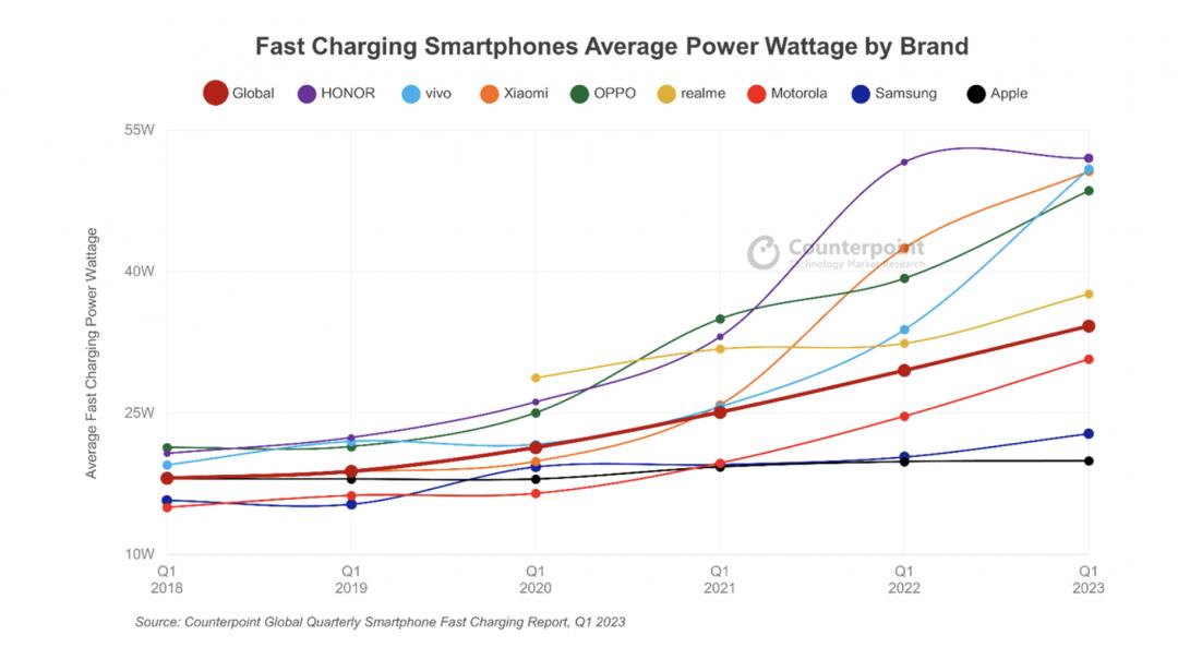 不少人是重度低头族,只要手机快没电就会感到焦虑,因此续航力和快充也成为很多人选购手机的重要考量,市调公司Counterpoint公布最新2023年第1季调查,全球智能手机快充平均功率来到34W,对比2022年第1季的调查数据为30W、2018年第1季只有18W,可见手机愈来愈重视快充功能。