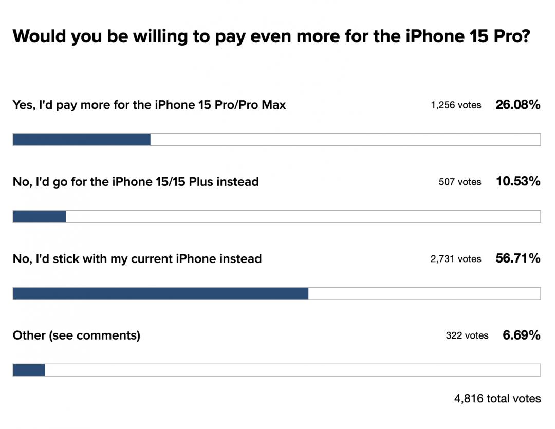 外媒9to5mac举办网络投票,“你愿意花更多钱购买iPhone 15 Pro系列吗?”来调查果粉对涨价的看法,近5千名网友投票,结果显示,超过56%的网友表示不买单,只有约26%愿意购买,约10%会选择iPhone 15或iPhone 15 Plus。 不过即使如此,每年苹果iPhone新机上市,都会掀起抢购风潮。