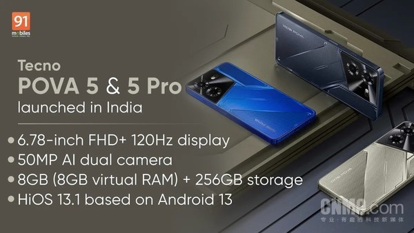 Tecno POVA 5 Pro则采用6.78英寸FHD+120Hz显示屏;搭载联发科天玑6080芯片,辅以8GB RAM和256GB存储;后置5000万像素AI双摄像头,前置1600万像素摄像头;配备5000mAh电池,采用68W快速充电技术。