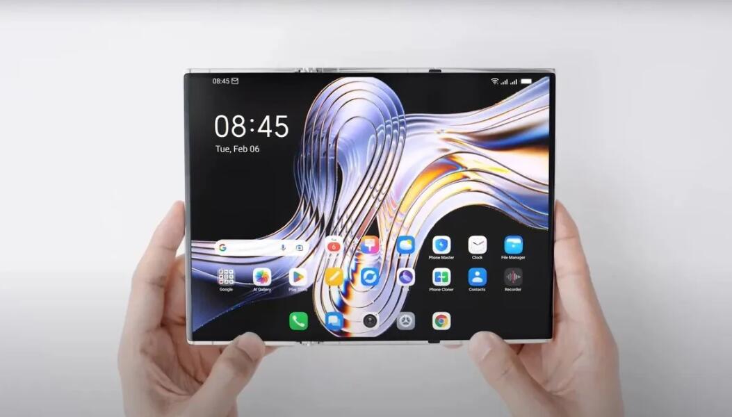 Tecno 优化了 Phantom Ultimate 2 的软件,以增强三个垂直窗口的多任务处理能力,并为不同的折叠场景提供适应性强的壁纸。最后,该设备在背面配备了一个用于摄影的三摄像头单元。从最后一张图片中可以看出,当屏幕完全展开时,三折手机完全出现。