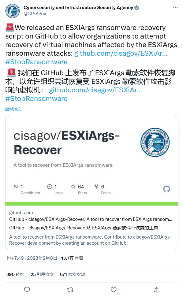 美国网络安全和基础设施安全局(CISA)近日发布了“ESXiArgs-Recover”脚本,来帮助受影响的用户抵御 ESXiArgs 攻击。CISA 表示该脚本是根据勒索软件入侵期间未成功加密的虚拟磁盘,重建虚拟机元数据编译的。