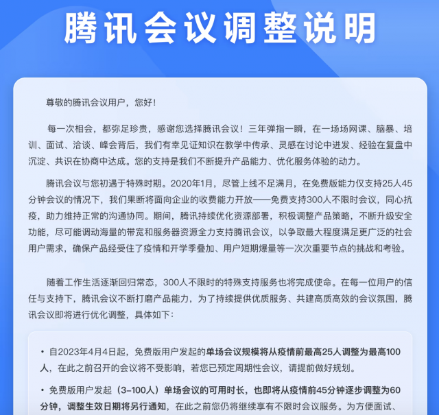 腾讯会议解释称,“2020年1月,尽管上线不足满月,在免费版能力仅支持25人45分钟会议的情况下,我们果断将面向企业的收费能力开放一一免费支持300人不限时会议,同心抗疫,助力维持正常的沟通协同。随着工作生活逐渐回归常态,300人不限时的特殊支持服务也将完成使命。”