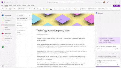 你可以向 Copliot 询问提示,例如“为我女儿的高中毕业派对制定计划”或“在新页面上将笔记汇总为要点”,云驱动的 AI 将尝试完成请求。微软表示,它将能够重新组织你的笔记本,调整格式,并突出显示重要的部分。