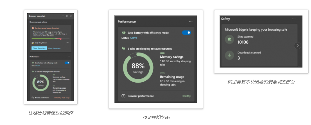 该部分将在 Edge 的工具栏中有一个专用的心跳图标。单击后,用户将首先看到浏览器的性能功能状态,包括来自效率模式、睡眠选项卡和性能检测器的状态。此外,该部分将具有自己的内置在线安全报告功能。它还将显示一些与安全相关的数字,这些数字与您的下载和在线会话期间扫描的网站有关。