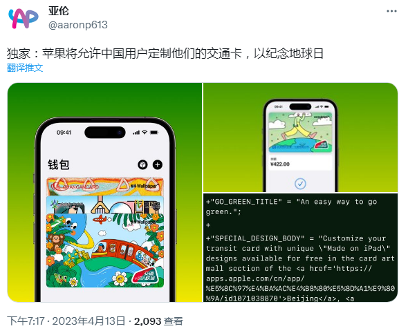 随着苹果准备庆祝地球日,据Aaron报道,苹果Apple Pay将允许中国用户定制交通卡。苹果每年都会在产品和服务中纪念地球日,有时会推出新功能。例如,在 2022 年,它在 Apple 地图中加入了 25 个新指南,以帮助用户找到自然界中的活动。