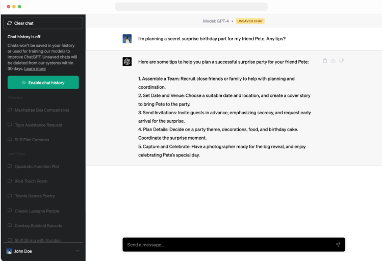 除了ChatGPT Business之外,OpenAI今天宣布了一项新功能,允许所有ChatGPT用户关闭聊天记录。OpenAI表示,禁用聊天记录时开始的对话不会用于训练和改进OpenAI的模型,也不会出现在历史记录侧边栏中。但它们将被保留30天,并“在需要时”进行审查,以监控滥用行为。