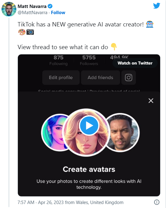 它看起来像Prisma Labs的Lensa应用程序,但新功能将内置于TikTok中,这意味着用户可以在他们的个人资料上拥有AI生成的头像。
