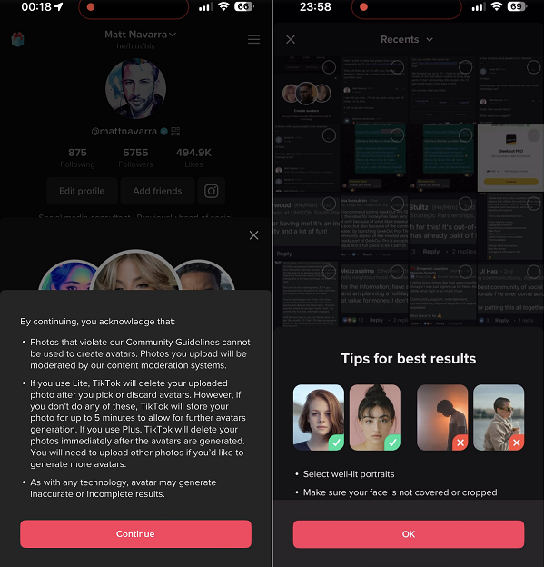 根据纳瓦拉的说法,用户每天只能使用一次AI Avatar工具。它将要求用户上传3-10张自己的图像,然后生成多达30个不同的头像。实际生成照片需要一些时间,生成后,您可以下载它们,将其中一个设置为您的头像,或将其发布到您的 TikTok 故事中。