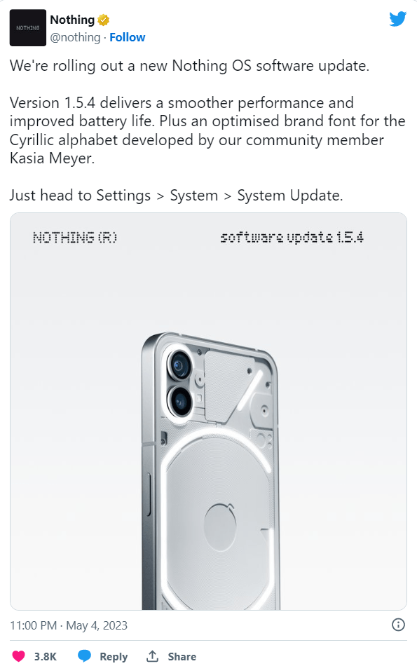Nothing官方昨日发文宣布,Nothing Phone(1)手机开始推送Nothing OS 更新 1.5.4。新的系统更新将解决几个问题,同时还引入了新功能和改进。