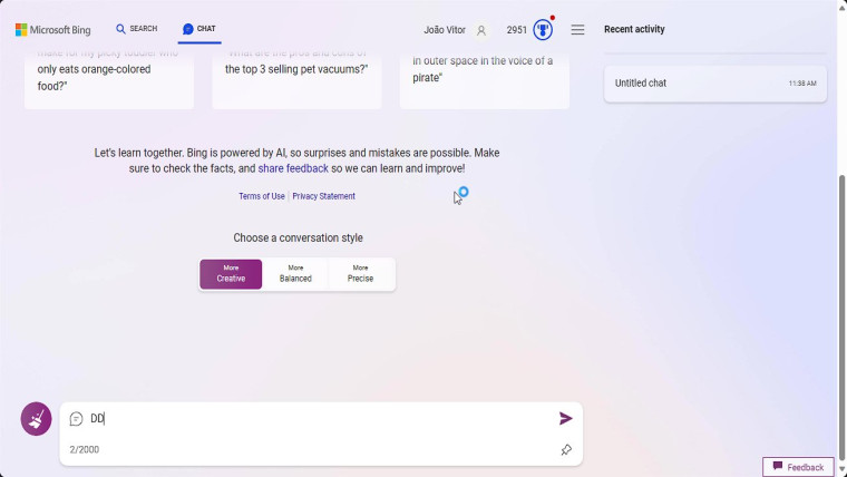 聊天历史记录功能显示在聊天窗口右侧的“最近活动”部分下。您将看到一个聊天列表,其中包含您拥有它们的确切时间。它还将显示导出聊天并与其他人共享聊天的选项。如果您不喜欢某个对话,可以从列表中删除该聊天记录。但是,无法在必应中禁用聊天记录。