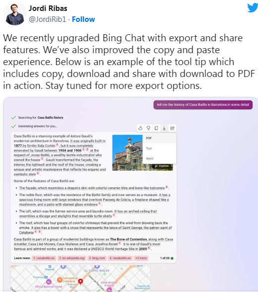 微软必应工程和产品部负责人Jordi Ribas今日发推文,微软最近升级了Bing Chat,引入分享和导出新功能。新功能允许无缝复制、下载和共享,并具有方便地转换为 Word 或 PDF 格式的附加功能。