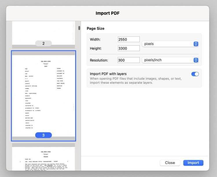 除了选择打开指定页面之外,3.4 新版本中还引入了名为“ Import PDF with Layers”的功能,用户可以选择要打开的文档的分辨率和大小。